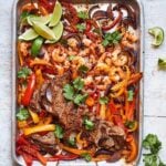 - Use a sharp knife to finely slice the rested steaks. Remove the tray from the oven, then mix the sliced steak back into the fajita mix.